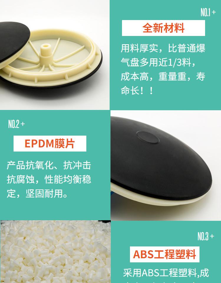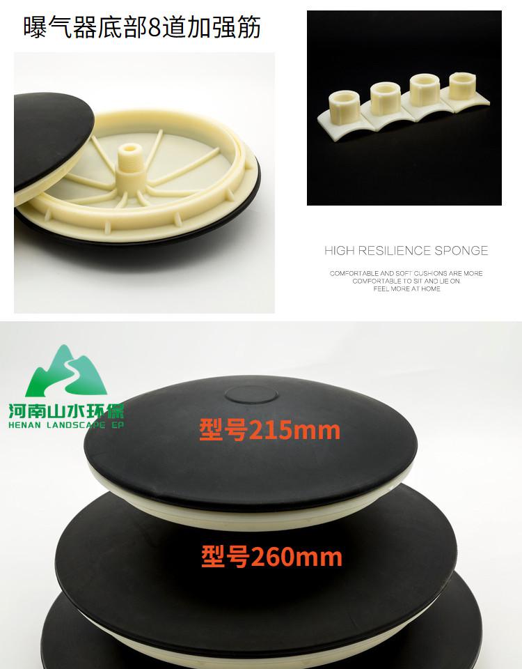 (1)橡膠膜片:選用進(jìn)口優(yōu)質(zhì)橡膠原料,根據(jù)曝氣工況需求量身定制材質(zhì)成分與配比,具有良好的物理、化學(xué)性能,有效防止膜片收縮、硬化與老化,延長產(chǎn)品壽命。