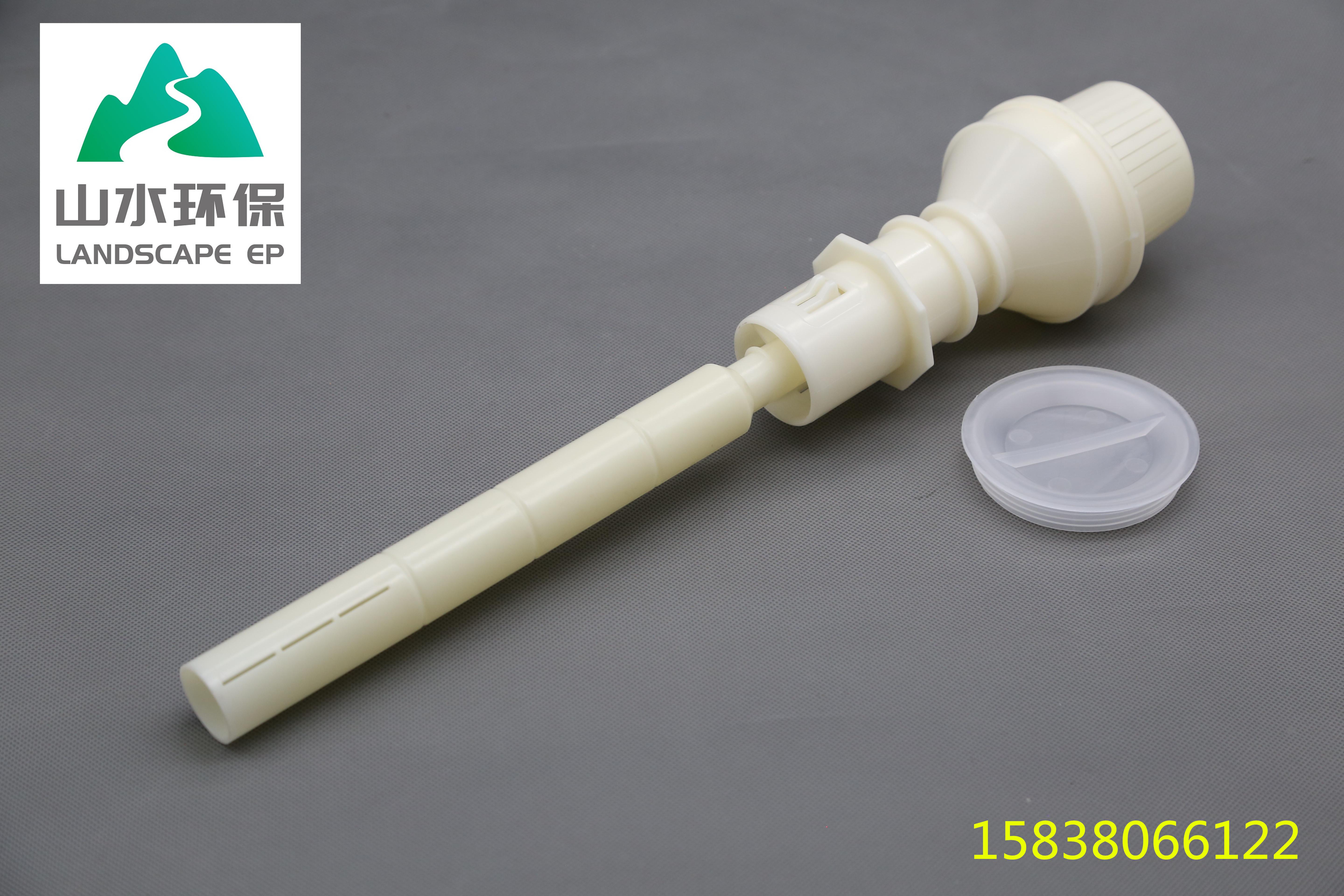 可調式長柄濾頭是一 種由濾桿、預埋件、和濾帽組成的可調節性長柄氣、水反沖濾頭,其特征在于濾桿是通過它上面的外螺紋和預埋件上的內螺紋,使它與預埋件相連接,其濾桿與預埋件之間的相對位置可調,另外在預埋件下部的外柱面上設置有4~8條具有彈性呈斜面狀的倒鉤,在預埋件上部的圓周邊端面上開有鋸齒形的斜齒,濾帽也是通螺紋與預埋件的上部相連,同時在濾帽中間圓盤的下端面也開有鋸齒形的斜齒,其斜齒的方向與預埋件上的斜齒方向相反。