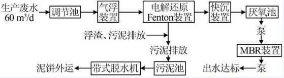 將原有調(diào)節(jié)池與缺氧池合并為新的調(diào)節(jié)池,在新調(diào)節(jié)池內(nèi)設(shè)置鼓風(fēng)曝氣系統(tǒng),在充分調(diào)節(jié)水質(zhì)水量的同時,保證油類及懸浮物等污染物不會上浮;出水經(jīng)地上泵提升至氣浮裝置,在氣浮裝置內(nèi)進(jìn)行部分加壓溶氣氣浮預(yù)處理,去除廢水中大部分油類污染物、大量懸浮物SS等,以減少后續(xù)電解還原Fenton電極板清洗頻次,并降低后續(xù)處理負(fù)荷。氣浮裝置出水自流進(jìn)入電解還原Fenton裝置,通過外加電場作用該廢水,由于該廢水中含Cl-質(zhì)量濃度高、導(dǎo)電性良好,外加電場后,聯(lián)合化學(xué)藥劑共同作用,化學(xué)反應(yīng)劇烈,可對廢水中大分子有機(jī)污染物進(jìn)行氧化分解;電解還原Fenton裝置出水自流進(jìn)入快沉裝置,通過調(diào)節(jié)pH使大量污泥沉淀;快沉裝置上清液自流進(jìn)入?yún)捬醭兀ㄟ^厭氧微生物的新陳代謝作用去除廢水中難降解的有機(jī)污染物;厭氧池出水經(jīng)地上泵提升至MBR裝置,通過好氧微生物的作用進(jìn)一步降解廢水中的有機(jī)污染物,同時利用MBR膜組件的截留功能維持MBR裝置內(nèi)較高的污泥濃度,以增強系統(tǒng)的耐沖擊負(fù)荷能力;MBR裝置出水經(jīng)出水泵抽至出水桶,達(dá)標(biāo)后納管排放。