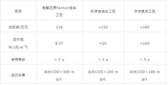 由表3可知,盡管反滲透與多效蒸發(fā)工藝處理出水COD更低,但投資、運行成本均高于電解還原Fenton組合工藝,經(jīng)實踐證明采用電解還原Fenton組合工藝是經(jīng)濟(jì)合理的。