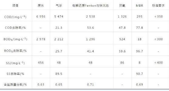 調(diào)試初期,對電解還原Fenton工藝的反應(yīng)電壓、電流及加藥量進(jìn)行了調(diào)試,對厭氧池采用接種化糞池污泥進(jìn)行接種,對MBR裝置采用洞頭區(qū)市政污水處理廠污泥濃縮池的污泥進(jìn)行接種。經(jīng)過近半年的試運行,采用該組合工藝處理該廢水,氣浮池、電解還原Fenton、厭氧及MBR設(shè)計COD去除率分別為25%、50%、65%、70%。具體進(jìn)、出水水質(zhì)及各工藝段去除率見表2。
