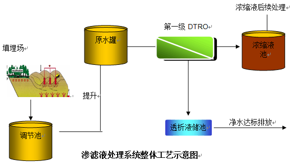 調(diào)節(jié)池滲濾液經(jīng)泵提升至滲濾液原水儲(chǔ)罐,進(jìn)行pH值調(diào)節(jié)、砂濾器、保安過(guò)濾器等簡(jiǎn)單預(yù)處理后,進(jìn)入單級(jí)DTRO,經(jīng)DTRO處理后產(chǎn)生的透過(guò)液排放,DTRO的濃水排至濃縮液儲(chǔ)池等待進(jìn)一步處理DTRO工藝整體處是流程如下圖所示: